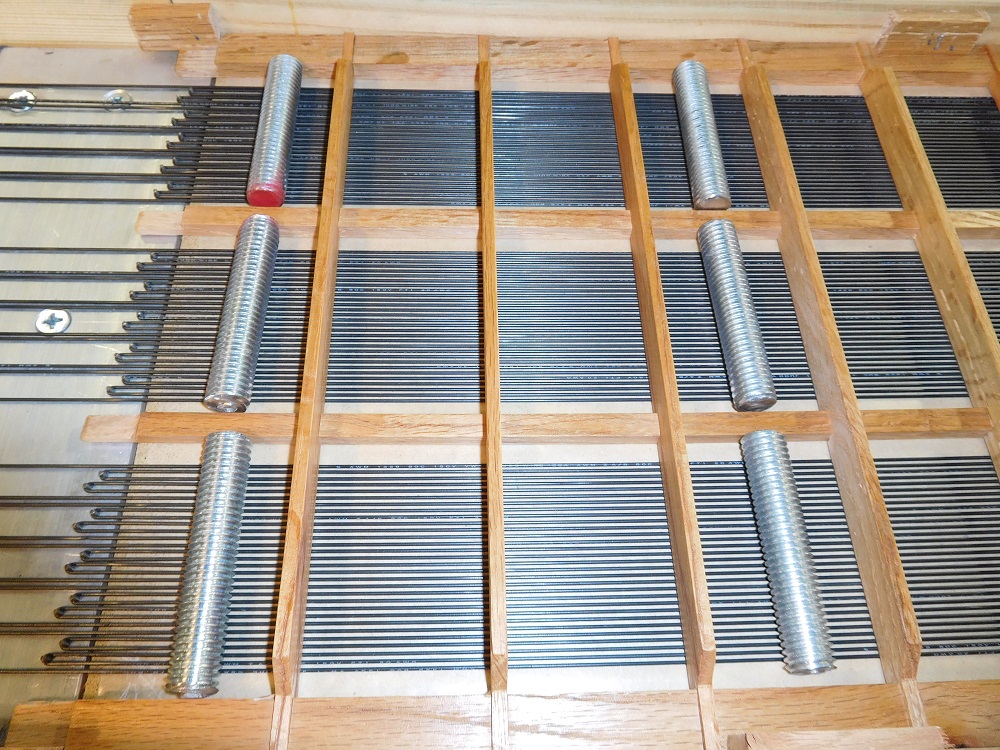 Stretching ninety 20-gauge wires at once requires a strong jig and about 4,000 pounds of force. The jig has a ¾ MDF platform mounted in a stout frame cut from yellow pine 4x4’s. The wire loops wrap over .063 diameter x .250 length steel pins inserted half depth into drilled 3/16” aluminum plates. The pins are angled 3 degrees from vertical to hook the wires.