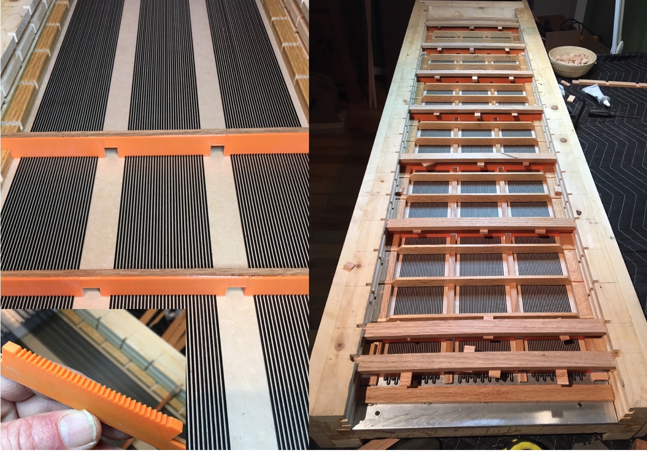 The 3D- printed wire guides were then installed, and finally the interlocking horizontal slats were glued down over the wires.